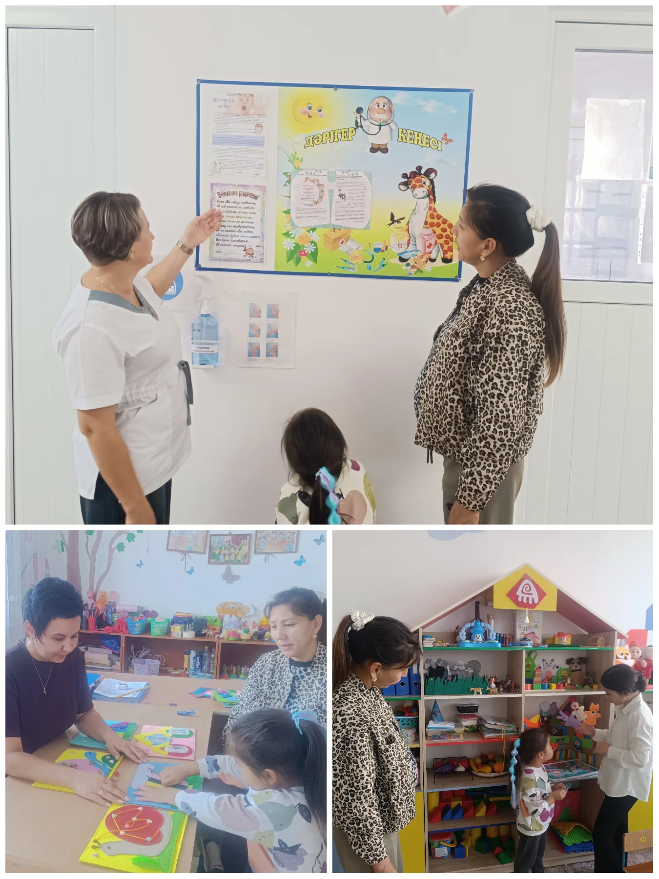 Қазан айының кеңес беру пунктінің жұмыс жоспарына сай балабақша кезегінде тұратын Мұрат Кәусармен (4 жас) медбике Фурсенко Л.В. «Денсаулық бұрышы» бойынша анасы Кусимова Гулсимге кеңнес берді; психолог Койбагарова Т.В. сенсорлық ойындар ойнатты; бөбекжайдағы ересек тобының тәрбиешісі : Әкімгерейқызы Венера «Қуыршақ ертегісін» көрсетті.